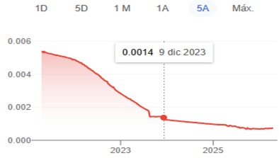 Este gráfico del valor de la moneda argentina durante los últimos cinco años demuestra el desplome en comparación con el dólar que experimentaba bajo gobiernos peronistas y que queda súbitamente frenado desde que Milei toma posesión el 10 de diciembre de 2023 y comienza a experimentar un alza moderada a partir de principios de 2026.